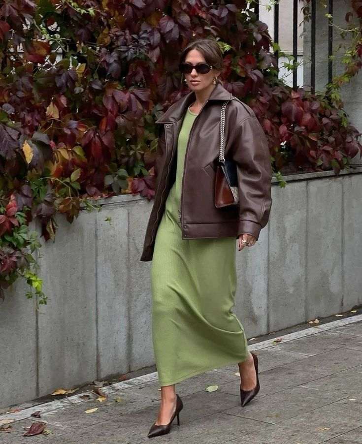 Нашиот денешен предлог е минт, макси фустан којшто ќе го комплетираме со кафеава кожна јакна со широк крој.