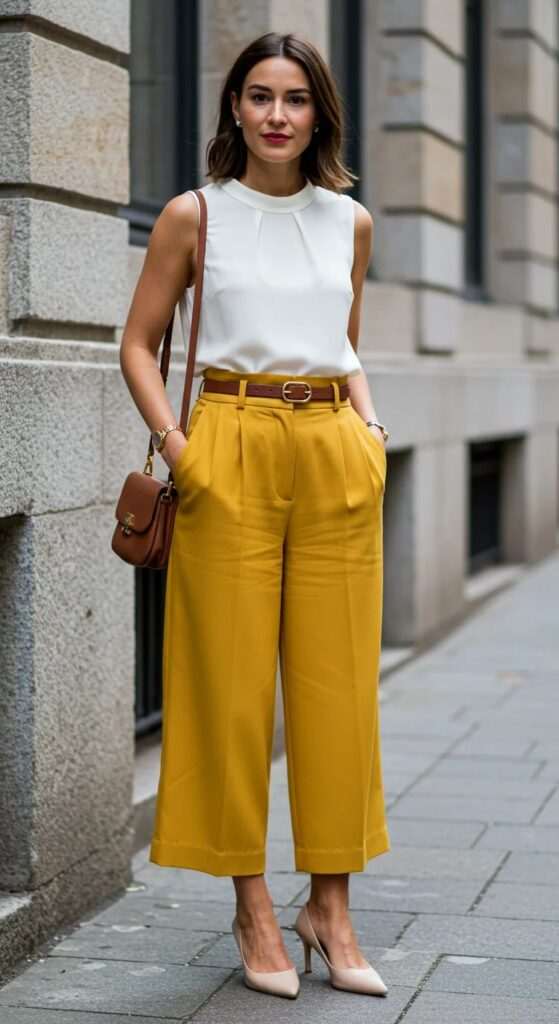 Нив ги комплетираме со елегантна бела маичка без ракави. Финишираме со беж потпетици, кафеава чанта и ремен во иста боја.