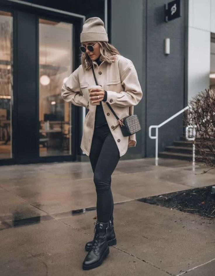 Комбинацијата ја дополнуваме со краток беж капут и плетено капче во иста нијанса.