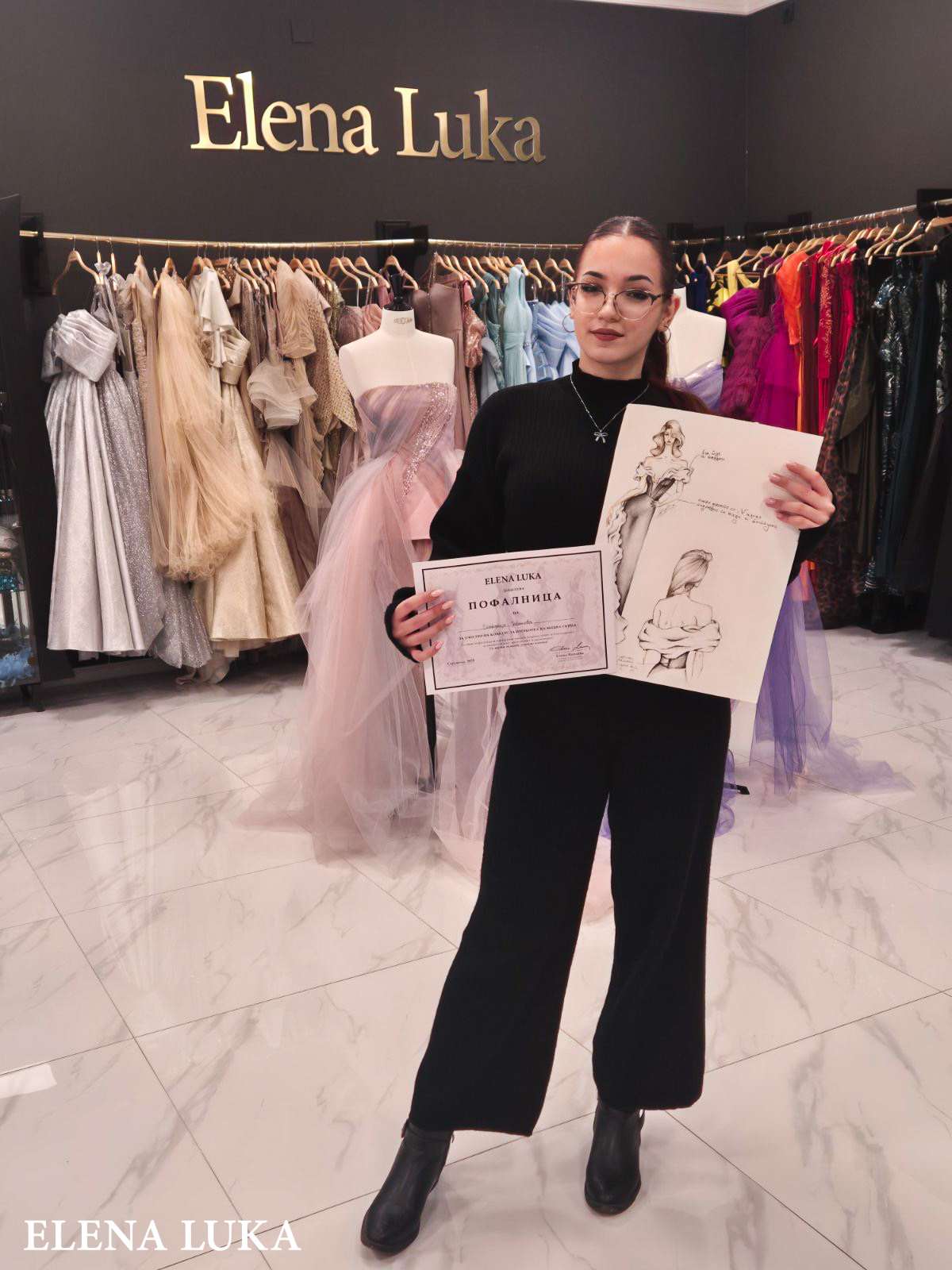 Стефанија Јованова покажа голем талент и креативност, освојувајќи ја првата награда за најдобро изработена скица за матурски фустан. Нејзината креација ќе оживее благодарение на тимот на ЕЛЕНА ЛУКА. Ова признание не само што ја истакнува нејзината уметничка визија, туку и ѝ отвора врати кон светот на модата.