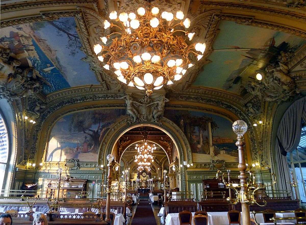 Архитектурата на Le Train Bleu е вистинска лекција по декоративна уметност. Позлатени лајсни и скулптурни елементи, масивни лустери од муранско стакло, релјефи и гипсени орнаменти, мермерни столбови и огледала.