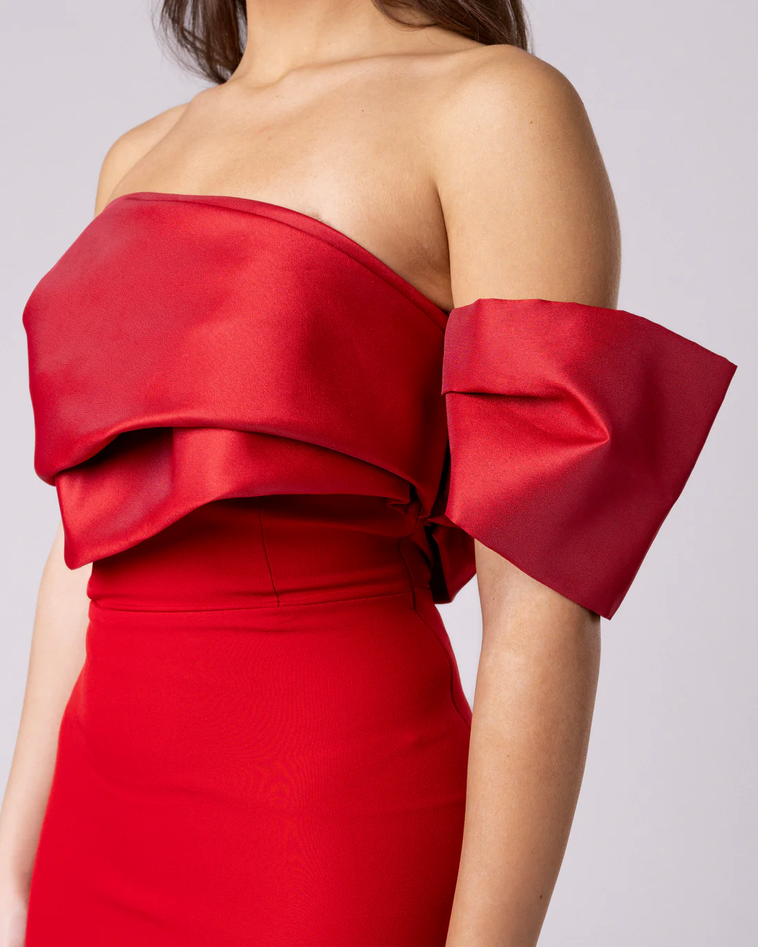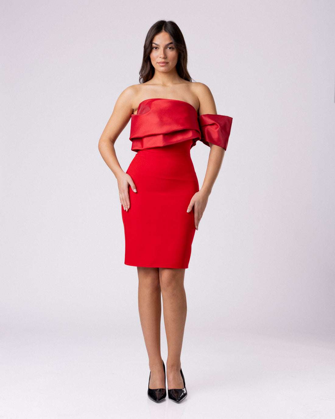LYRA е елегантен фустан со отворени раменици и внимателно дефинирана силуета што ја слави женската форма без да ја наметнува. Горниот дел е меко обликуван, изработен од сатен со луксузна текстура која нежно паѓа околу рамениците, создавајќи софистициран и сензуален контраст со чистиот, прилепен крој на здолништето. Секој набор, секоја линија е промислена, ништо не е случајно, ништо не е вишок.