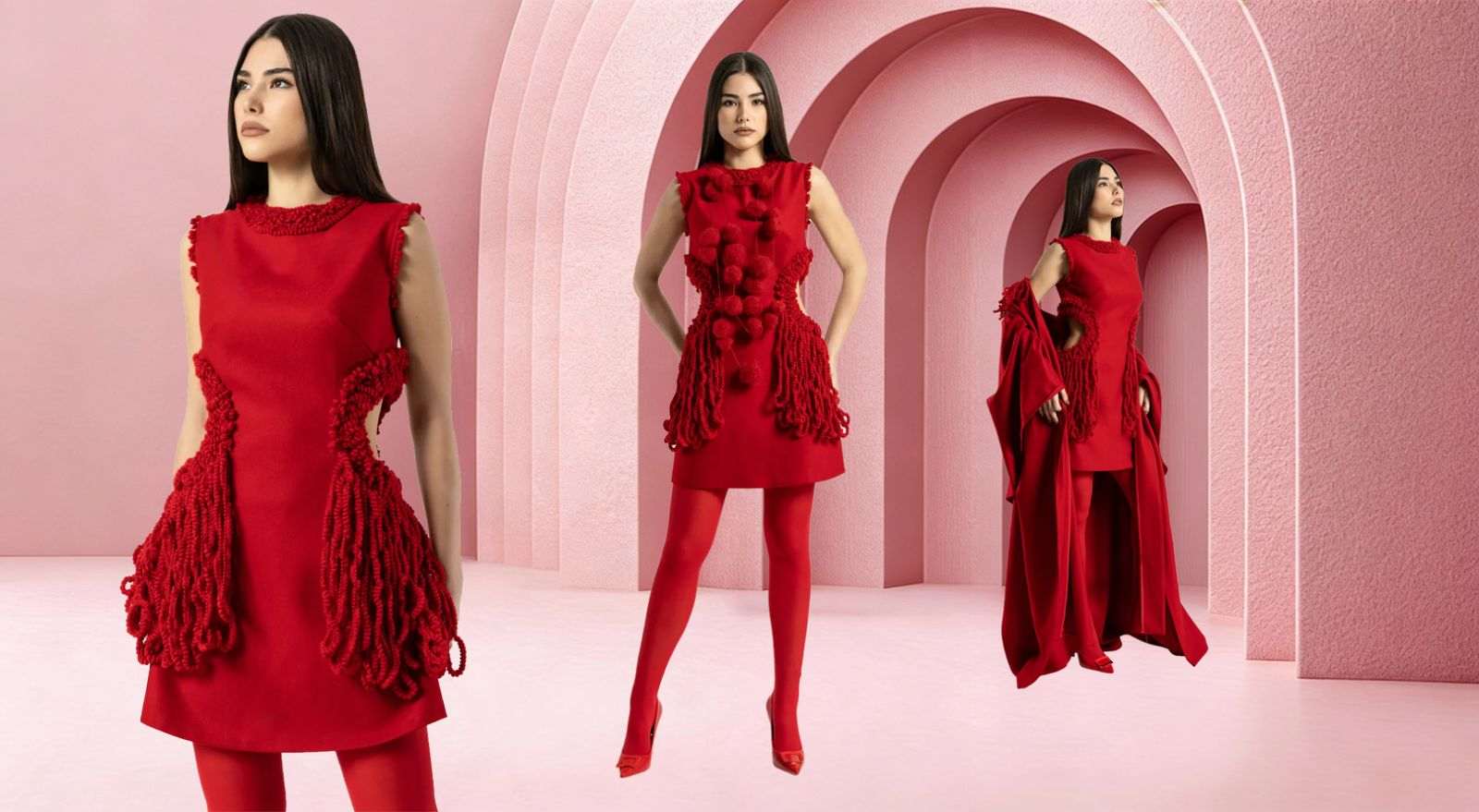 Креацијата на ELENA LUKA претставува впечатлив cape dress, збогатен со рачно изработени детали кои ја носат приказната за внимателен процес, трпеливост и посветеност. Фустанот е украсен со прецизно аплицирани волнени реси, кои внесуваат истовремено шик софистицираност и суптилен ретро карактер, создавајќи визуелен ефект што не поминува незабележано.