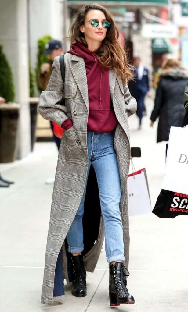 Денешната среќна среда ја резервираме за макси кариран капут во сива нијанса, којшто го дополнуваме со фармерки и бордо дуксер.