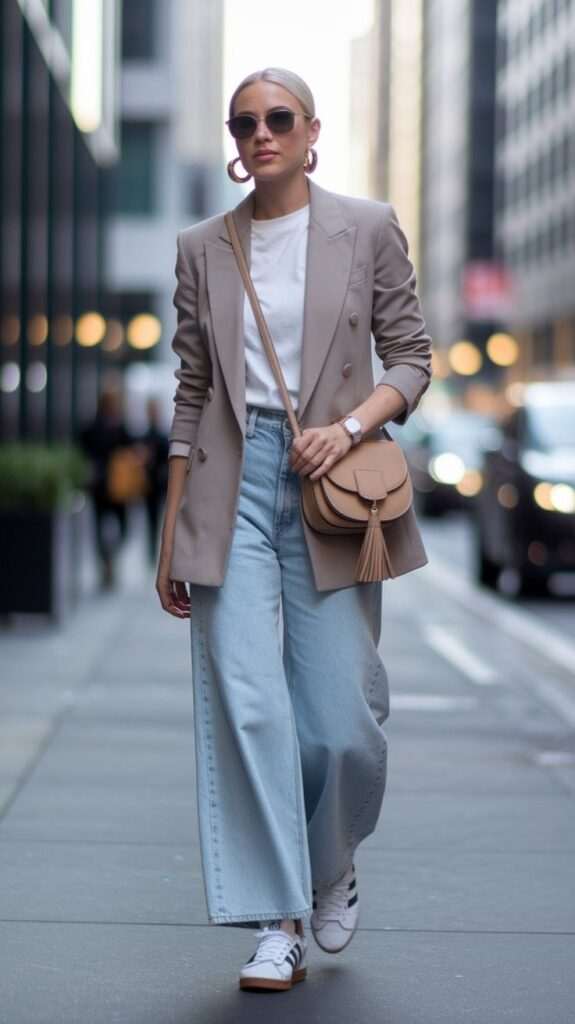Оваа класична комбинација ја дополнуваме со блејзер во беж нијанса.