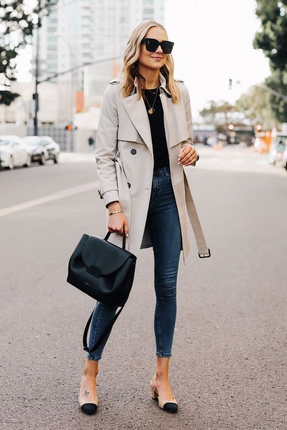 Среда е ден за класична комбинација со која што никогаш нема утка. Предложуваме фармерки, црна блуза и беж мантил.