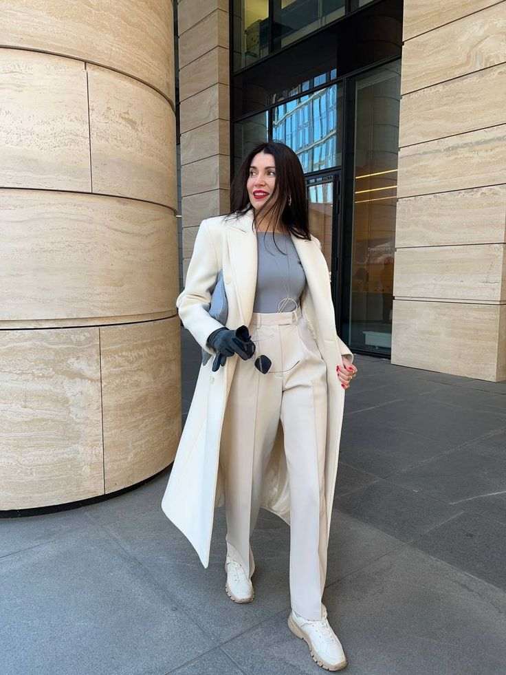 Вака стилизирани дополнуваме со елегантен, макси крем капут и патики во иста нијанса. Заокружуваме со црни ракавици и чанта во пастелно сива боја.