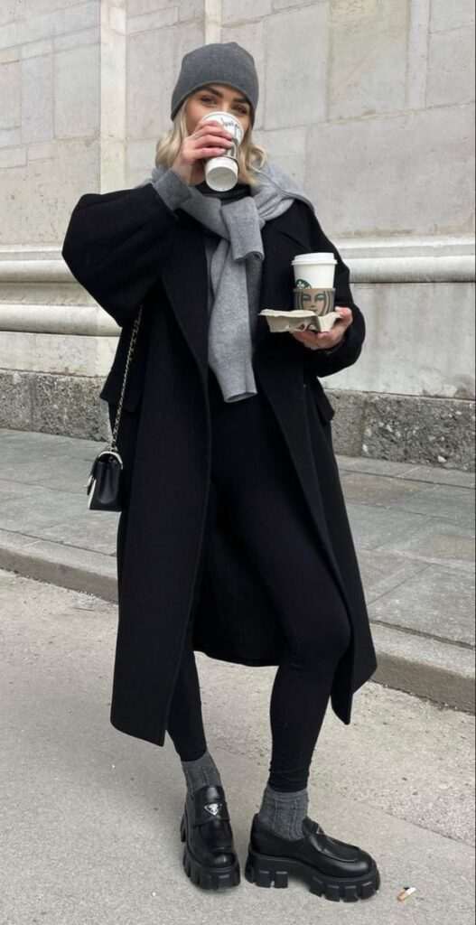 Предложуваме црни хеланки коишто носиме со темно сиви чорапи и сива блуза. Дополнуваме со црн капут, сиво плетено капче и црни чевли на платформа.