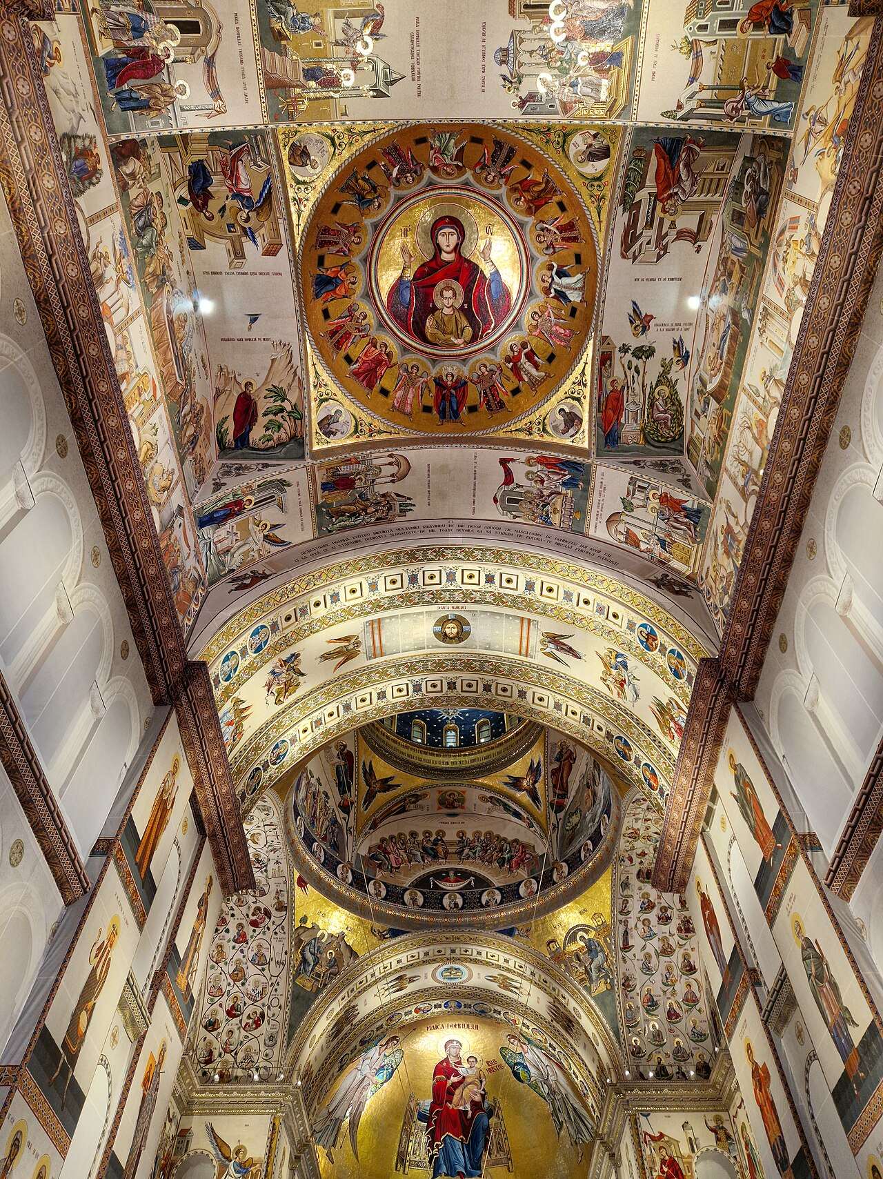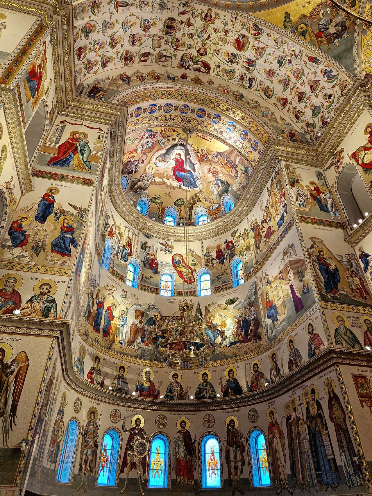 Мозаичните површини внатре се изведени да симболизираат историски и духовни етапи на православието, вклучувајќи апостоли, црковни отци и современи светители од романскиот контекст.
