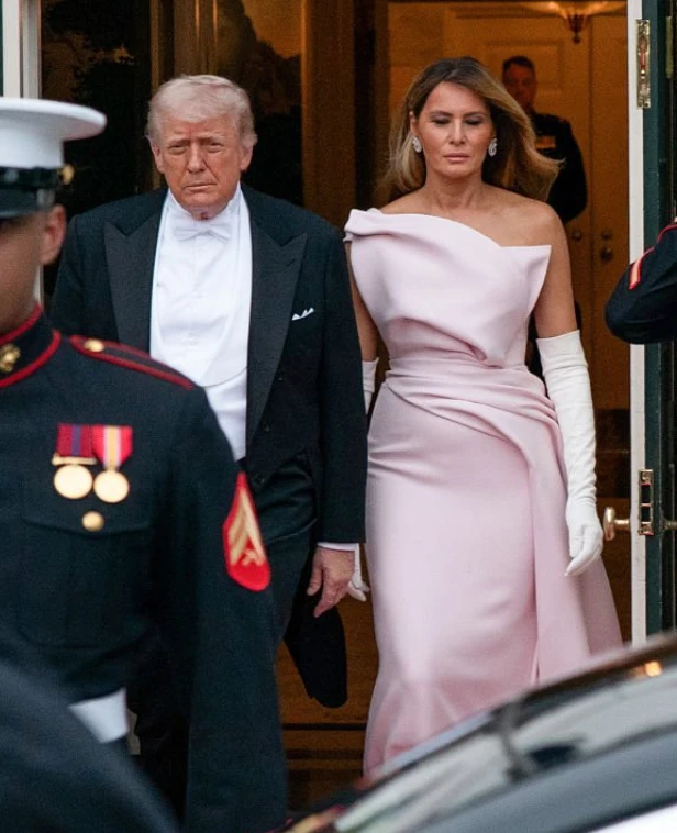 Облечена во бледорозова тоалета од Christian Dior Haute Couture, Меланија понуди изглед кој на прв поглед делуваше речиси нежно, меки линии, минималистичка силуета и тивка елеганција која не се обидуваше да се натпреварува со раскошот на вечерта.
