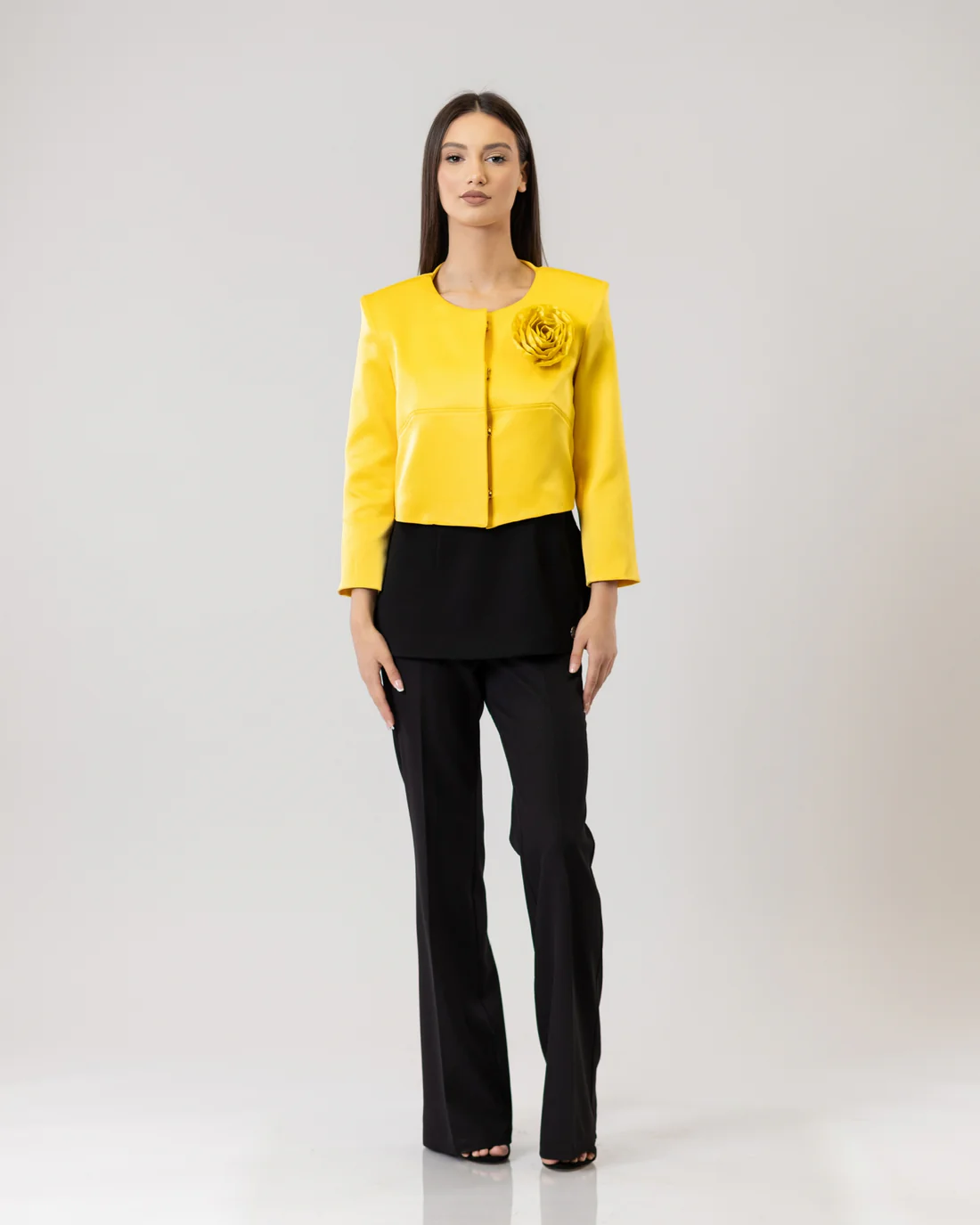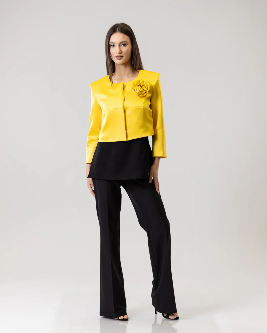 Минималистичкиот крој е надополнет со впечатлив тридимензионален цветен аплициран детаљ на рамото, роза која внесува романтика, драматичност и висока мода во целокупниот изглед. Чистите линии и силниот колорит го прават ова парче совршен избор за жени кои сакаат да се издвојат со стил.