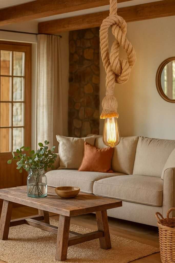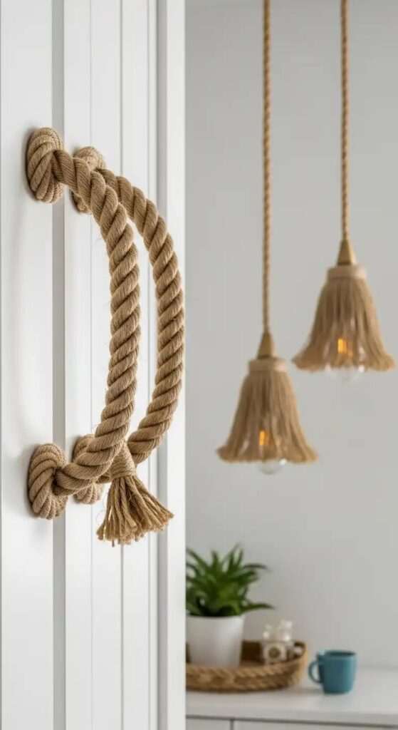 Јажето е идеално за да се направат оригинални лустери или светилки. Завиткајте го околу основата на светилката или направете висечки лампи со мрежа од јаже. Светлината што минува низ таквата структура создава топла и пријатна атмосфера.