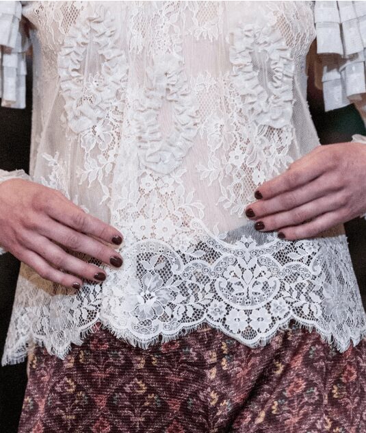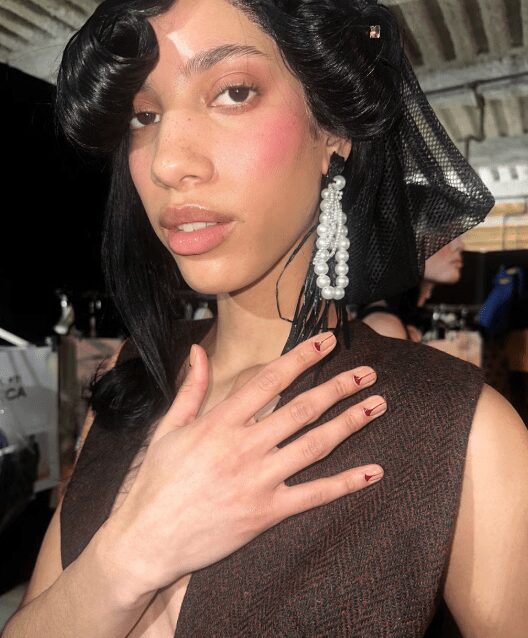 - Christopher John Rogers: Дизајнерот познат по својата храброст во боите, оваа сезона се определи за речиси црни нијанси. Уметникот за нокти Soon Choi создаде длабок црвенкасто-црн изглед, додавајќи мистериозен, но безвременски допир на колекцијата.