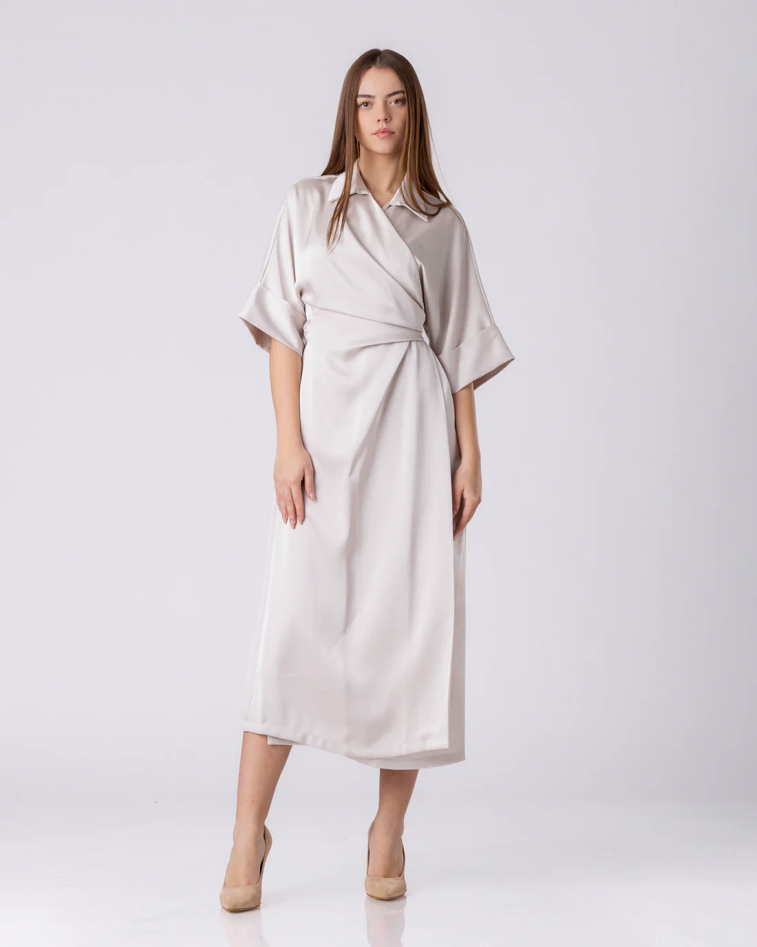 Satin Ease – фустан кој ја претвора удобноста во елеганција. Мазниот сатен нежно ги следи линиите на телото, додека плисираниот преден преклоп и скулптурните ракави создаваат женствена, смирена софистицираност.