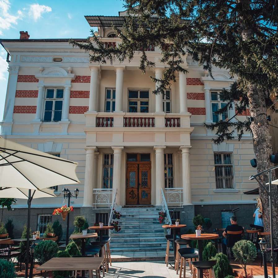 Објектот е симетрично организиран и потенцира репрезентативни елементи на фасадата, со јасна хоризонтална линија и класични декоративни детали.