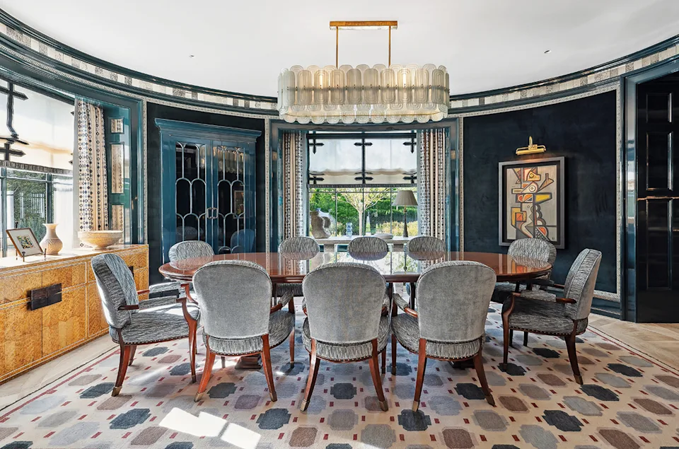Она што особено го привлекува вниманието е трпезаријата, простор кој не е уреден на класичен начин, туку инспириран директно од уметнички дела. Токму моќните слики на современи уметници ја одредиле палетата на бои, материјалите и атмосферата во просторијата, покажувајќи дека уметноста може да биде срцето на целиот ентериер.