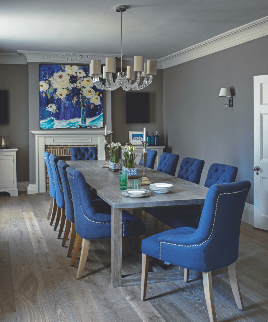 Во домот на Сталоне доминираат интензивни нијанси на сина боја, инспирирани од уметничките дела што ја обликувале трпезаријата. Сината се појавува на лакираниот стол, стаклениот лустер и декоративните елементи, што му дава на просторот драматичен, но елегантен карактер.
