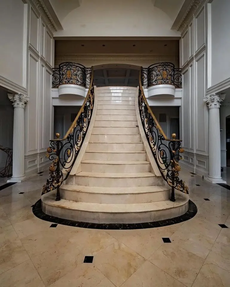 Надворешноста ветува раскош, коринтски столбови, богати камени релјефи и големи балкони што гледаат кон некогаш уредени, а сега диви градини. Но чекорот внатре е парадоксален.