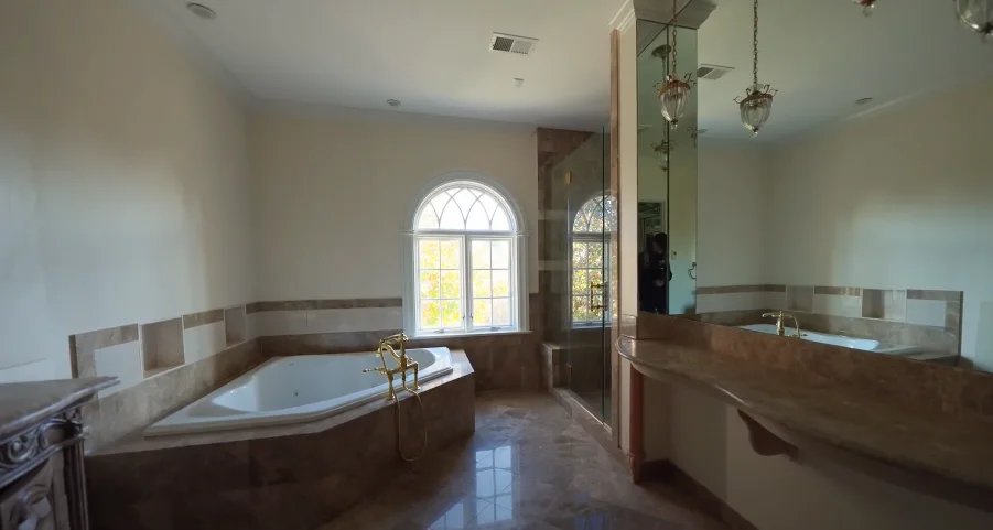 Две гардеробери, негова и нејзина педантно средени, фустани Valentino, чевли Louboutin, кожни парчиња Ferragamo, сите во заштитна пластика. Бањата нуди парна туш-кабина и џакузи, беспрекорно чисти, без ниедна трага од вода.