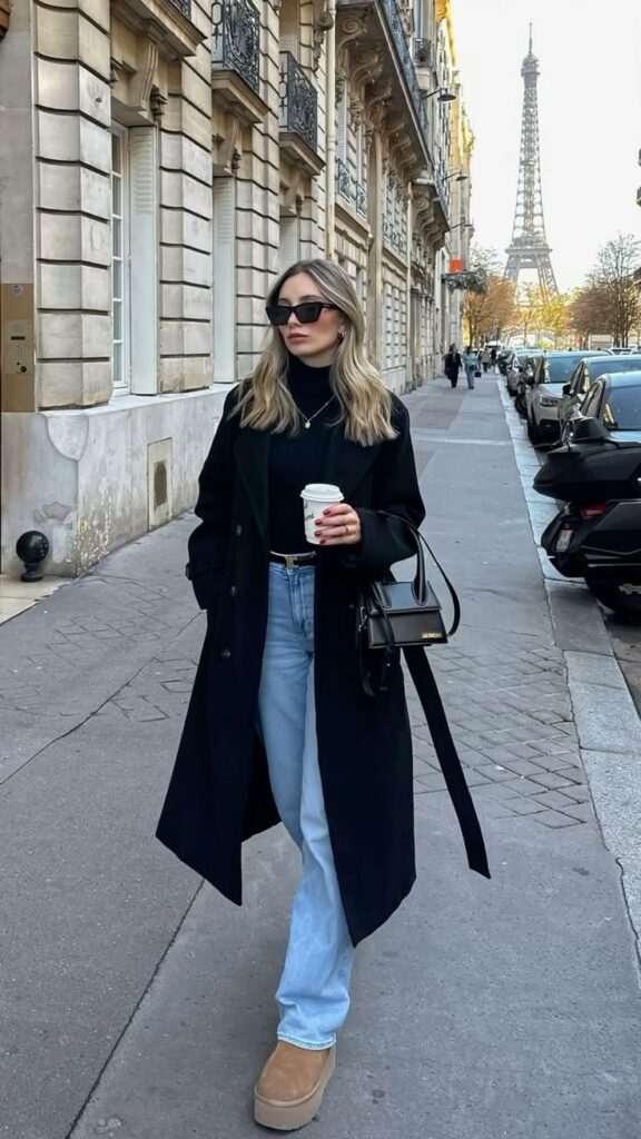 Предложуваме светол џинс којшто го спојуваме со црна ролка. Стајлингот го дополнуваме со црн капут и ремен во иста боја.