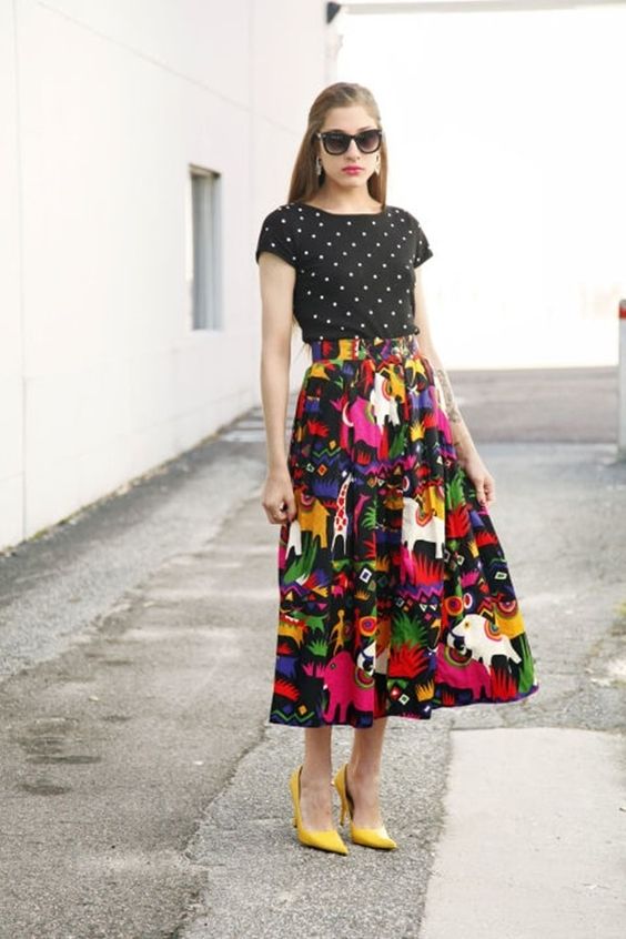 За овој вторник избравме колоритно миди здолниште со висок струк на кое се илустрирани животни и разни шари на црна основа.