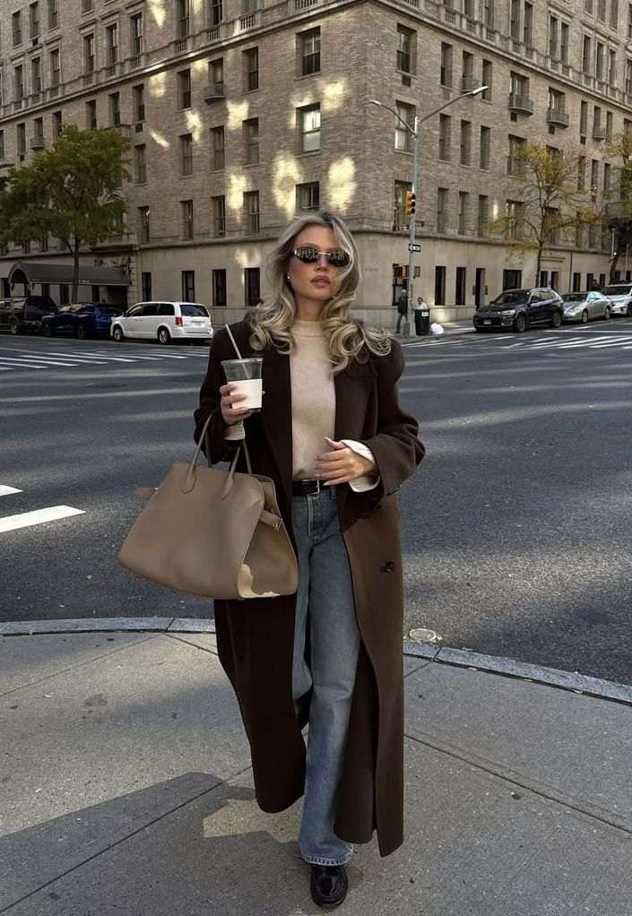 Денешниот вторник е за комбинација од крем и кафена. Предложуваме макси кафеав капут, класичен џинс и крем џемпер.