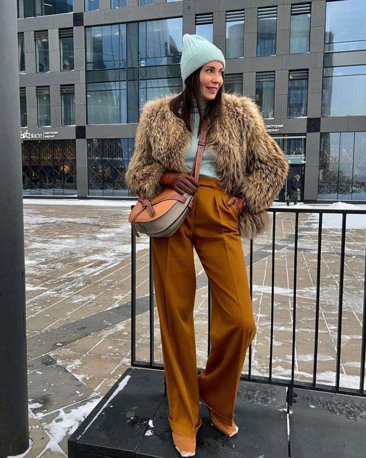 Вторник е ден за крзнена јакна во песокливи нијанси којашто ја спојуваме со класични, окер панталони.