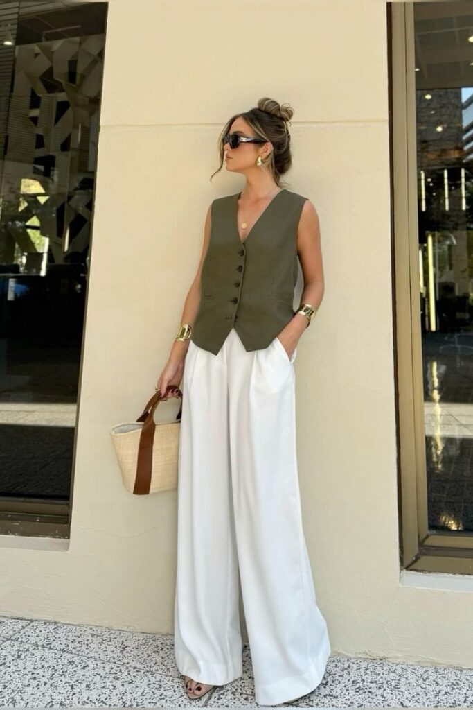 Вторничкиот стајлинг го резервираме за широки бели панталони коишто ги комбинираме со елегантно елече во маслинесто зелена боја.