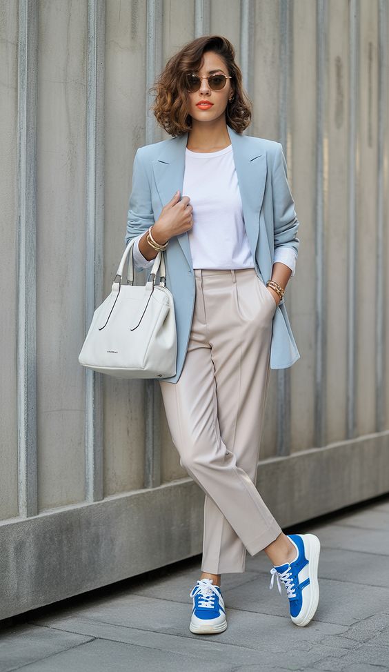 За овој вторник резервираме свеж пролетен стајлинг. Спојуваме беж панталони и бела блуза, во комбинација со блејзер во светло сина нијанса.