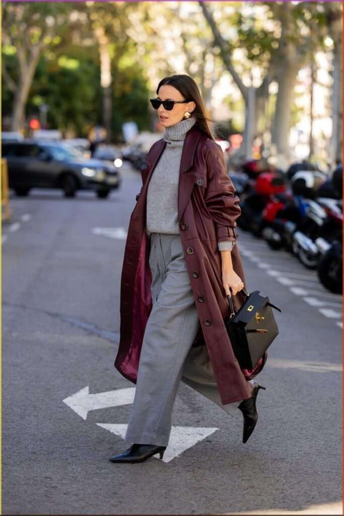Вака стилизирани дополнуваме со кожен бордо мантил и црни чевли на ниска потпетица. Финишираме со црна чанта.