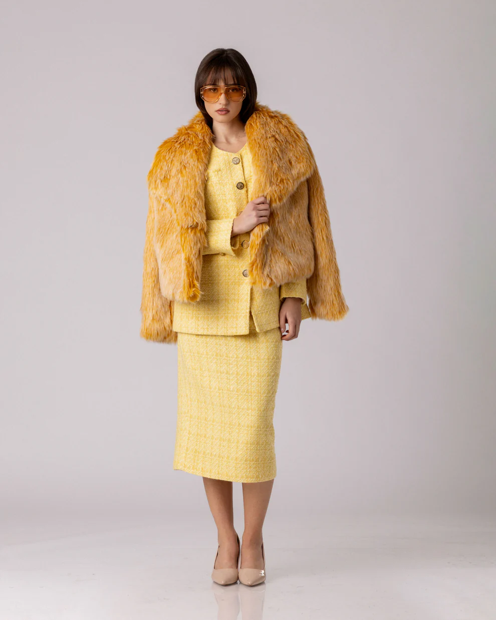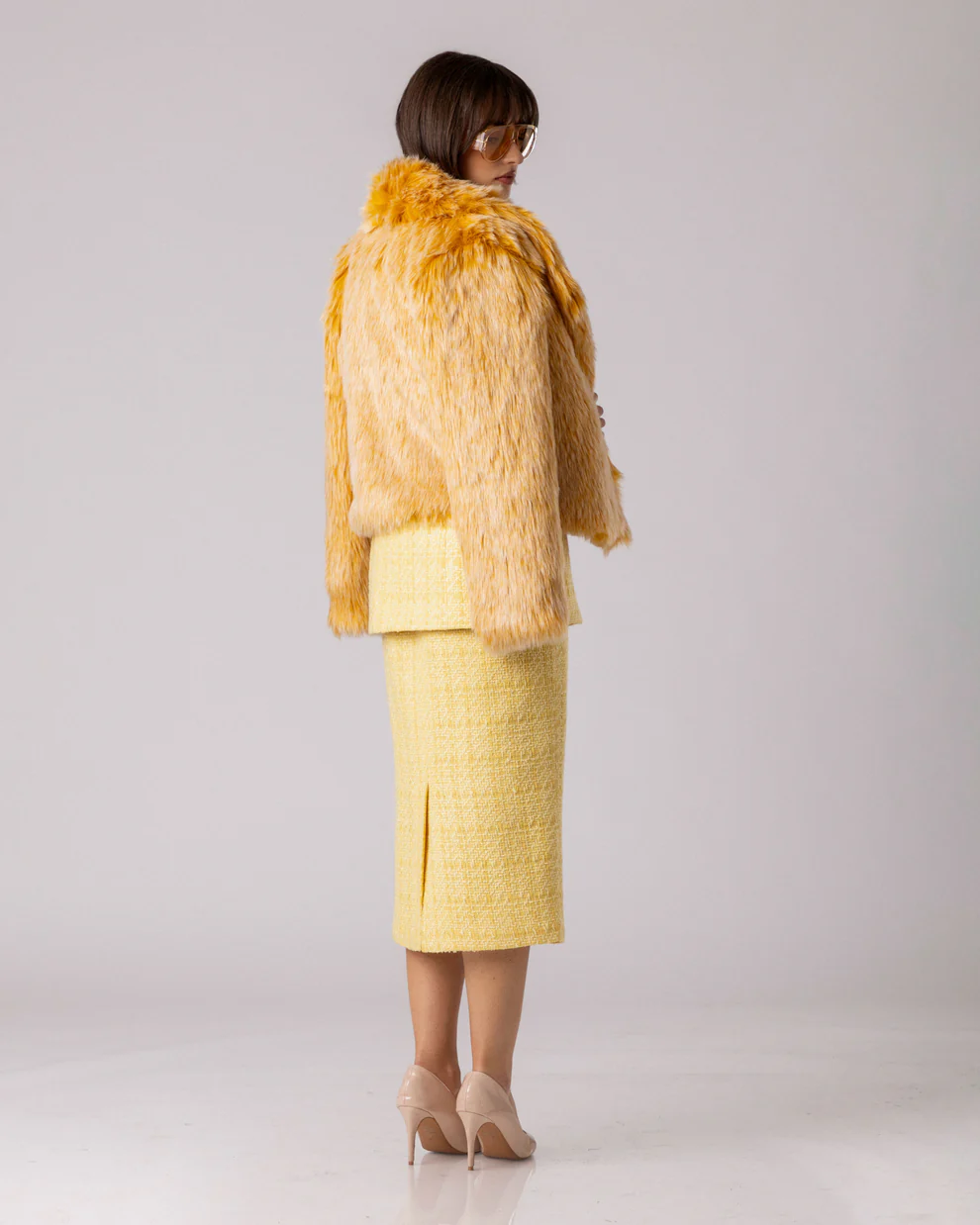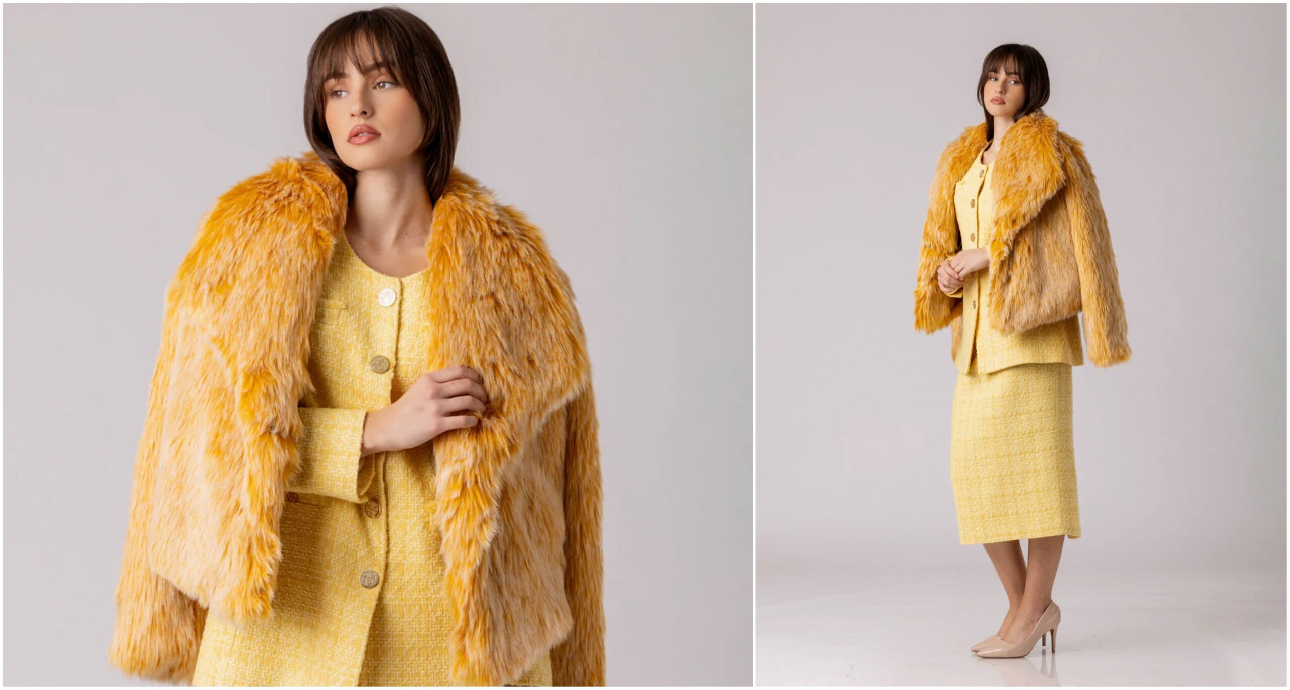 Се работи за кратка бунда од вештачко крзно во богата златна нијанса, дизајнирана да го издигне секој изглед со топлина, текстура и впечатливо присуство. Меката волуменозност и рафинираната силуета создаваат смел, но елегантен надворешен слој за самоуверен и современ стил.