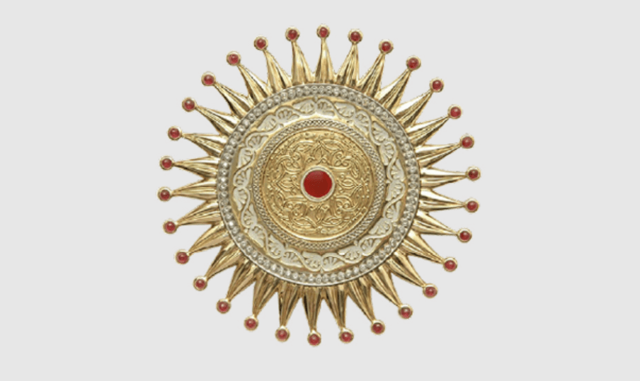 Особено впечатлив е штитот на ѕвездата: композиција од брановидни, тутунолики зраци кои завршуваат со топчести форми инкрустирани со рубини. Во самиот центар е поставен доминантен рубин, опкружен со флорална стилизација и палмети – мотиви што асоцираат на античкото и средновековното културно наследство на Македонија. Маргиналниот венец е изработен од низа брилијанти, што дополнително ја нагласува свеченоста и ексклузивноста на одликувањето.
